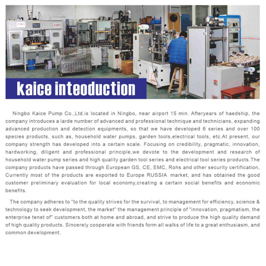 宁波凯思泵业有限公司位于宁波,距机场15分钟车程。公司引进先进技术和技术人员,扩大生产设备,已开发6个系列、100多个品种产品,包括家用抽水泵、园艺工具、电动工具等,实力达一定规模。 公司秉持诚信、务实、创新、勤奋、正直和专业原则,专注家用抽水泵、高品质园艺工具及电动工具系列的研发与生产。产品通过欧洲GS、CE、EMC、RoHS等安全认证,大部分出口欧洲及俄罗斯市场,获当地客户对性价比的好评,创造了一定社会效益和经济效益。 公司管理原则为“以质量求生存,以管理求效益,以科技求发展,以市场求创新”,企业信条为“创新、务实”,致力于满足国内外客户对高品质产品的需求,愿与各界朋友热情合作、共同发展。